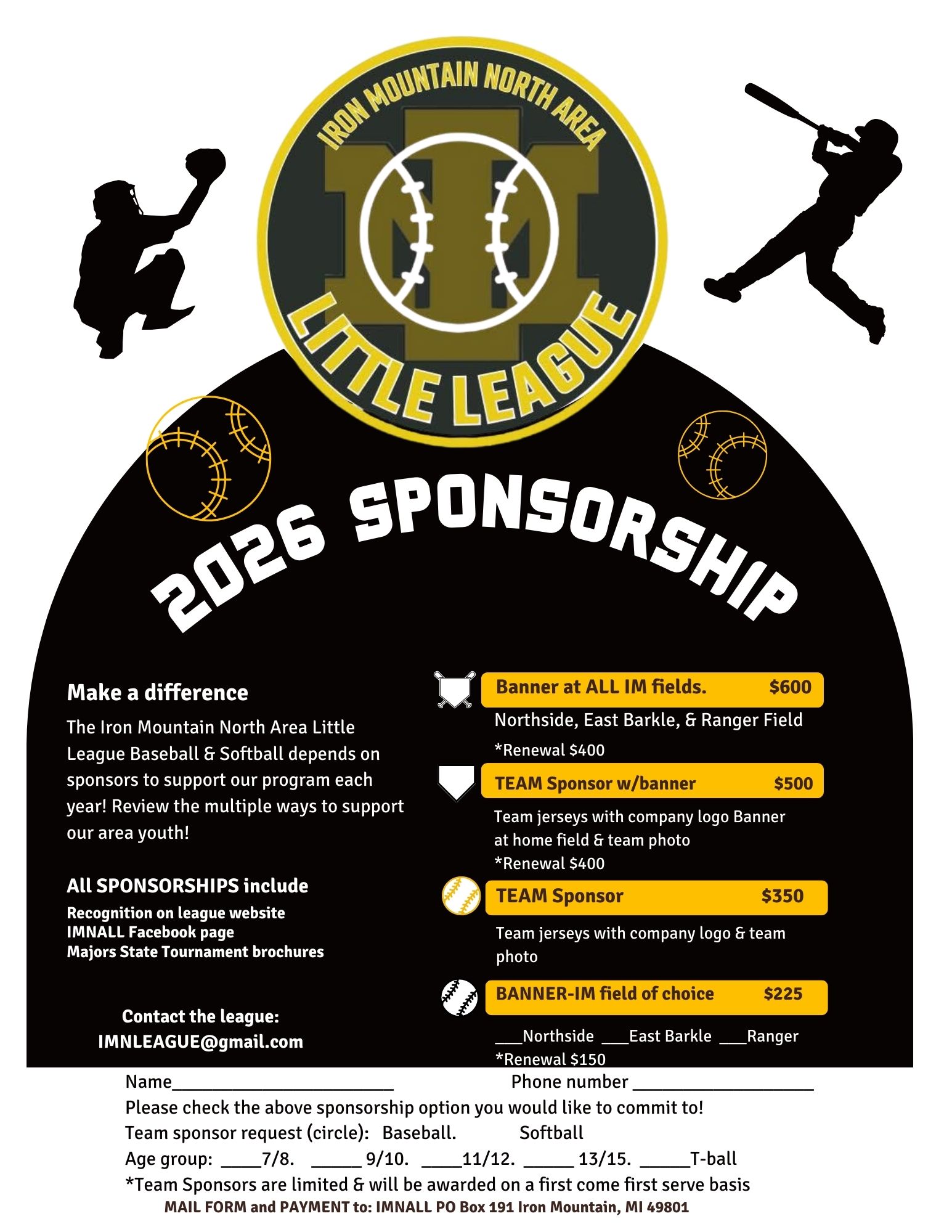 The Iron Mountain North Area Little League Baseball & Softball leagues depend on sponsors like you to support our program each year.